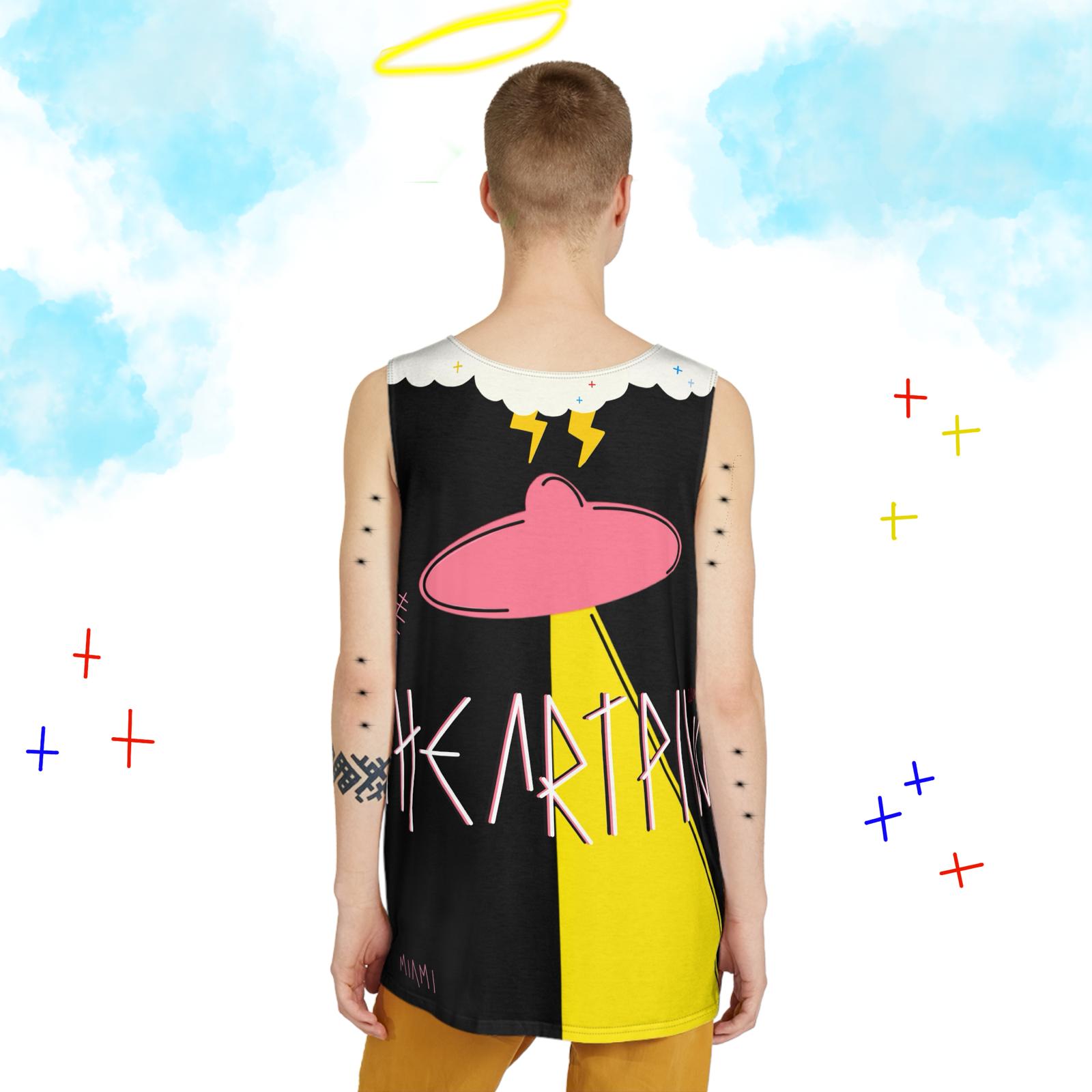 Documented as if from an otherworldly archive, this tank records the instant of disappearance. Figures rise into the beam of alien luminance, their forms suspended against the geometry of the unknown. Each panel captures the progression of vanishing, as though the fabric itself were a field sketch observed under impossible conditions. Only 100 worldwide are preserved, every piece a rare entry in the visual record of abduction.