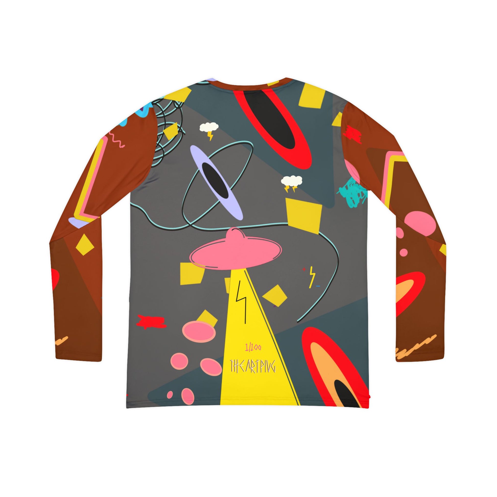Filed like a mural of imagination, the "Art Teacher" Long Sleeve V-Neck Shirt assembles galaxies, UFOs, and fragments of cosmic sketches into one restless composition. Its surface is dense with detail, a blackboard of the unknown that rewards every second glance with a new discovery.