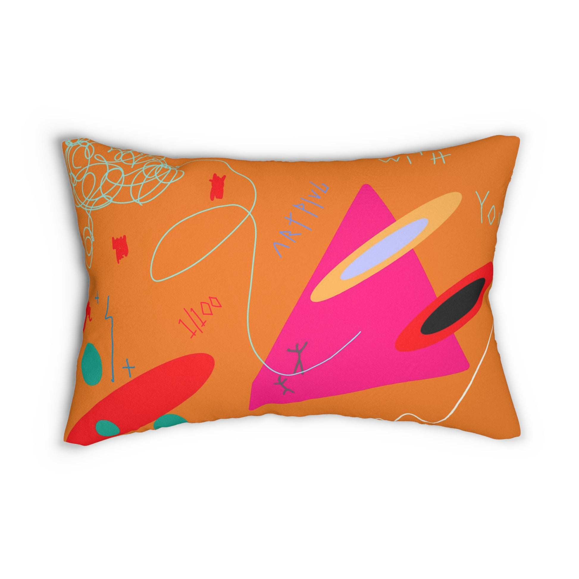 This lumbar pillow carried restless marks and shifting lines, a surface that suggested a sketchbook stretched across fabric. Each angle revealed fragments of drawing in progress, as if the design refused to settle into a final form.